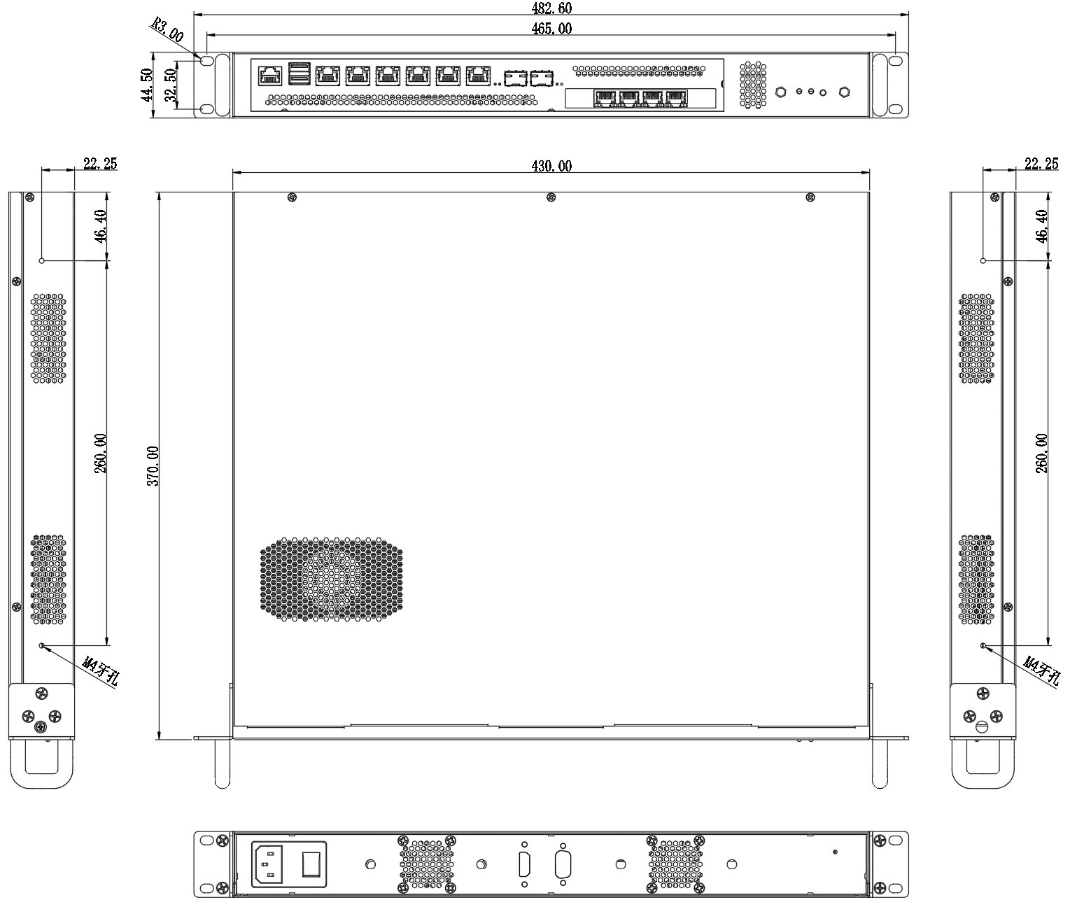 2*4020系統風扇、1*電源開關、1*VGA接口、4*天線孔、1*HDMI敲落孔 |