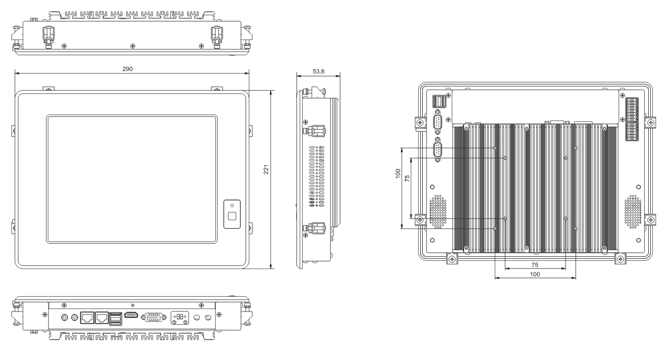 5*RS-232, 1*RS422/485,2個DB9接口RS-232 3個三線RS-232, 2*USB2.0,2*USB3.0, 1*14BIT GPIO端口, 1*LINE OUT 1*MIC, 2*Wifi天線接口, 1*按鈕開關(guān), 1*VGA 最大分辨率支持2048x1536 1*HDMI 最大分辨率支持3200*2000@60HZ |